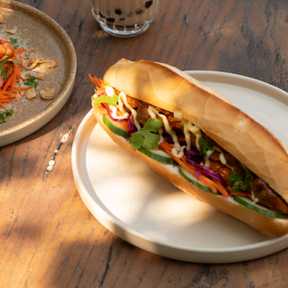 Char Siu Pork Banh Mi: Marinated, roasted pork with a smoky flavor, served with pickled vegetables, cucumber, and cilantro.